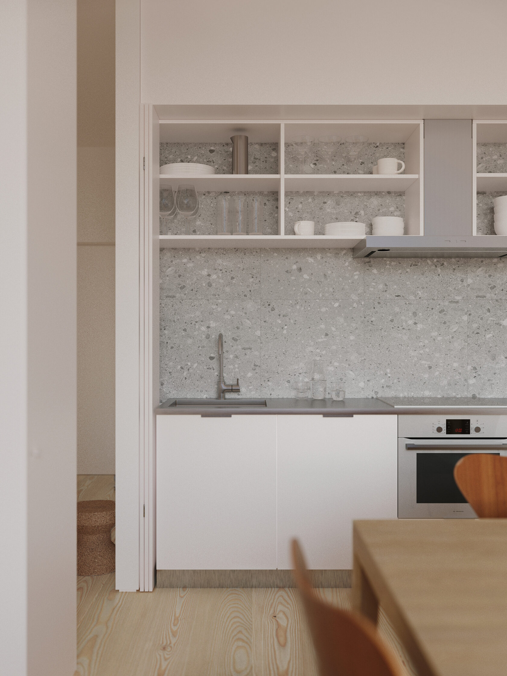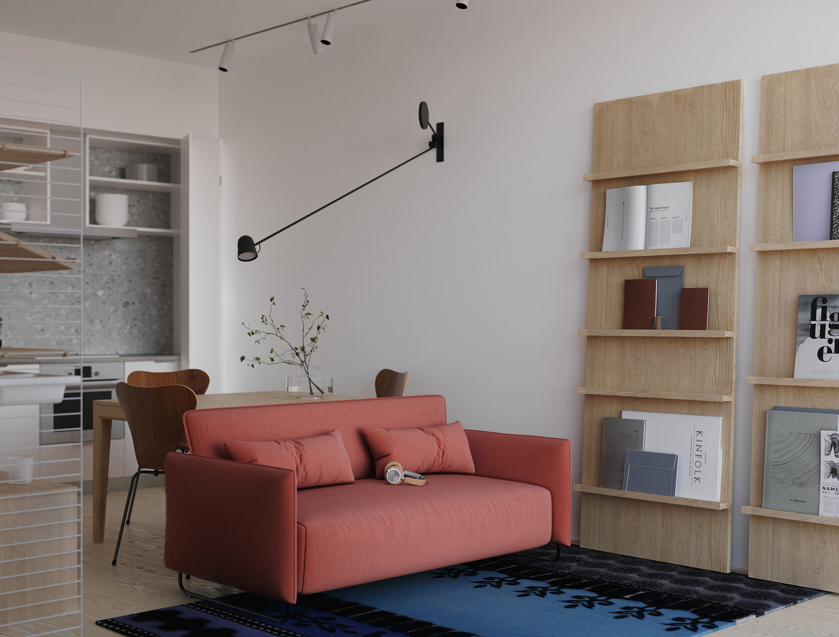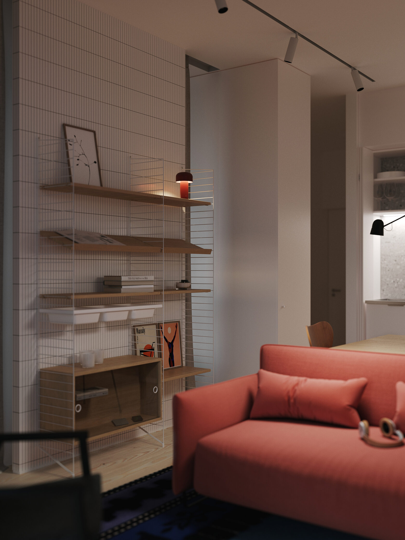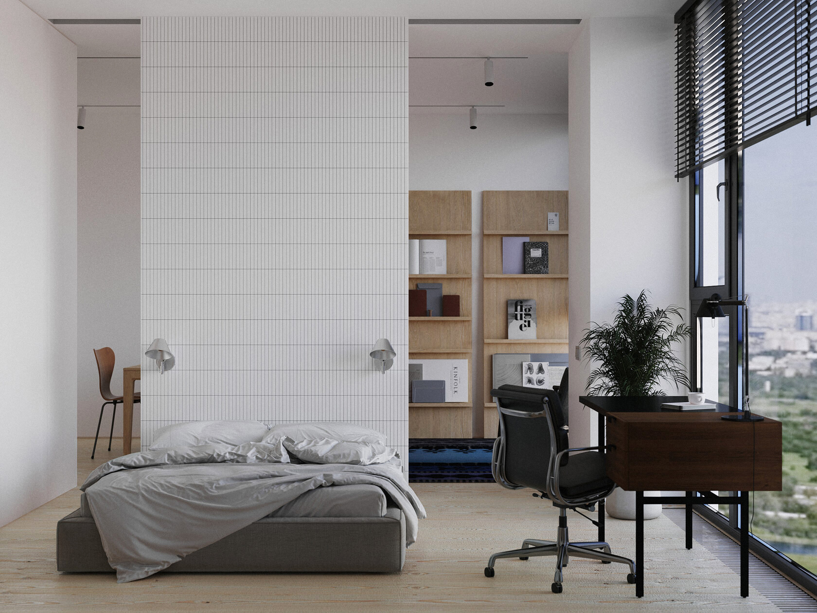 Зону кухни-столовой и спальни отделяет перегородка, облицованная мелкой плиткой. Внутри перегородки интегрирован электрический карниз, куда прячутся шторы.