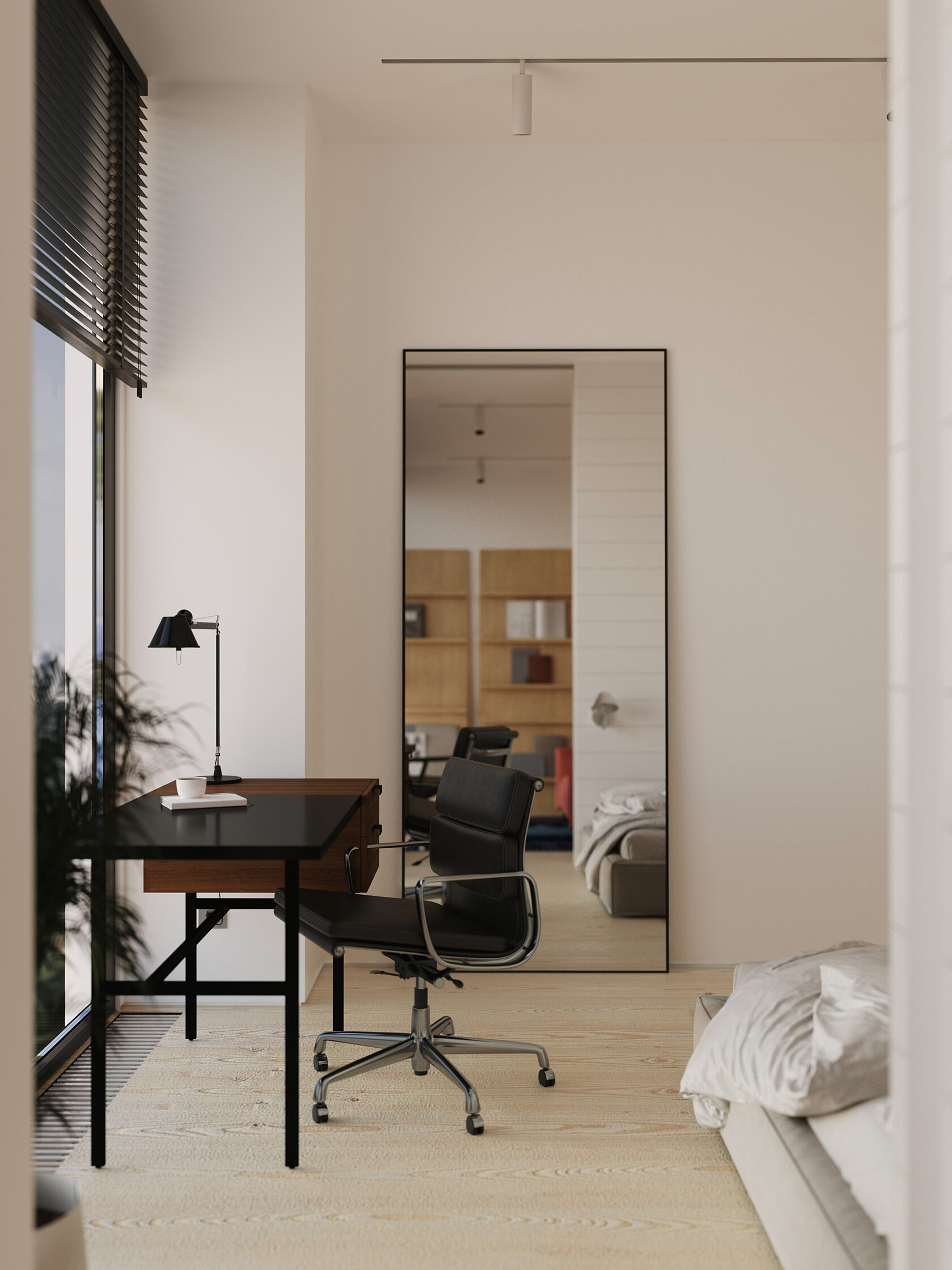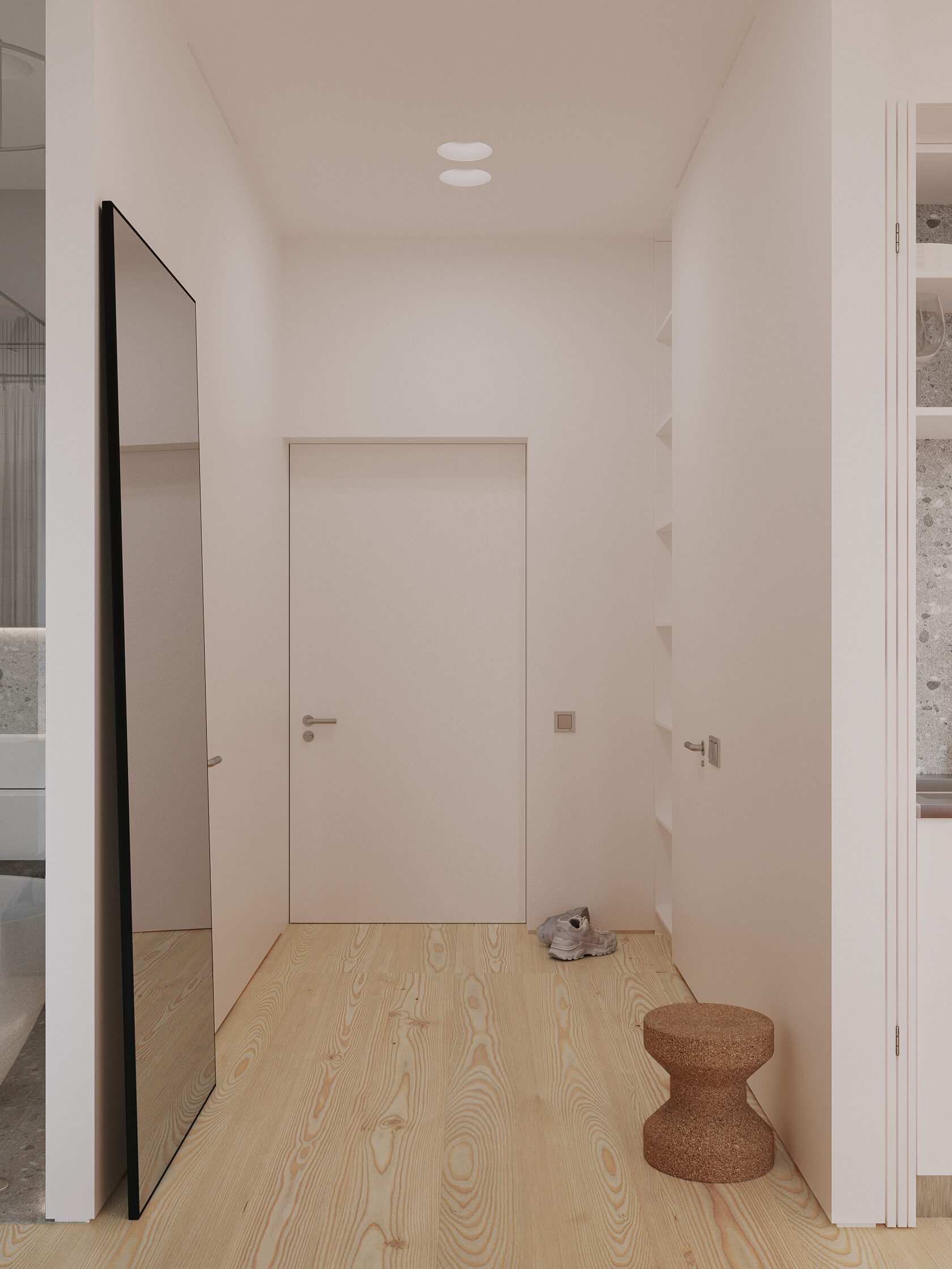 Лаконичная прихожая с крупным зеркалом, скрытыми фунrциональными шкафами и пробковым табуретом Vitra