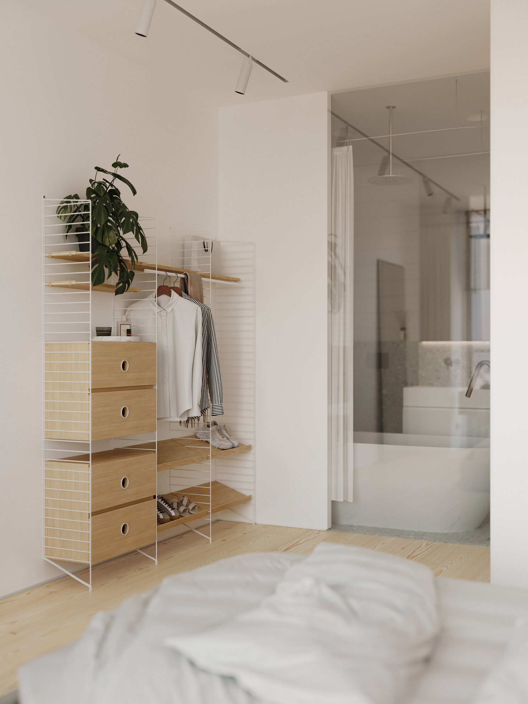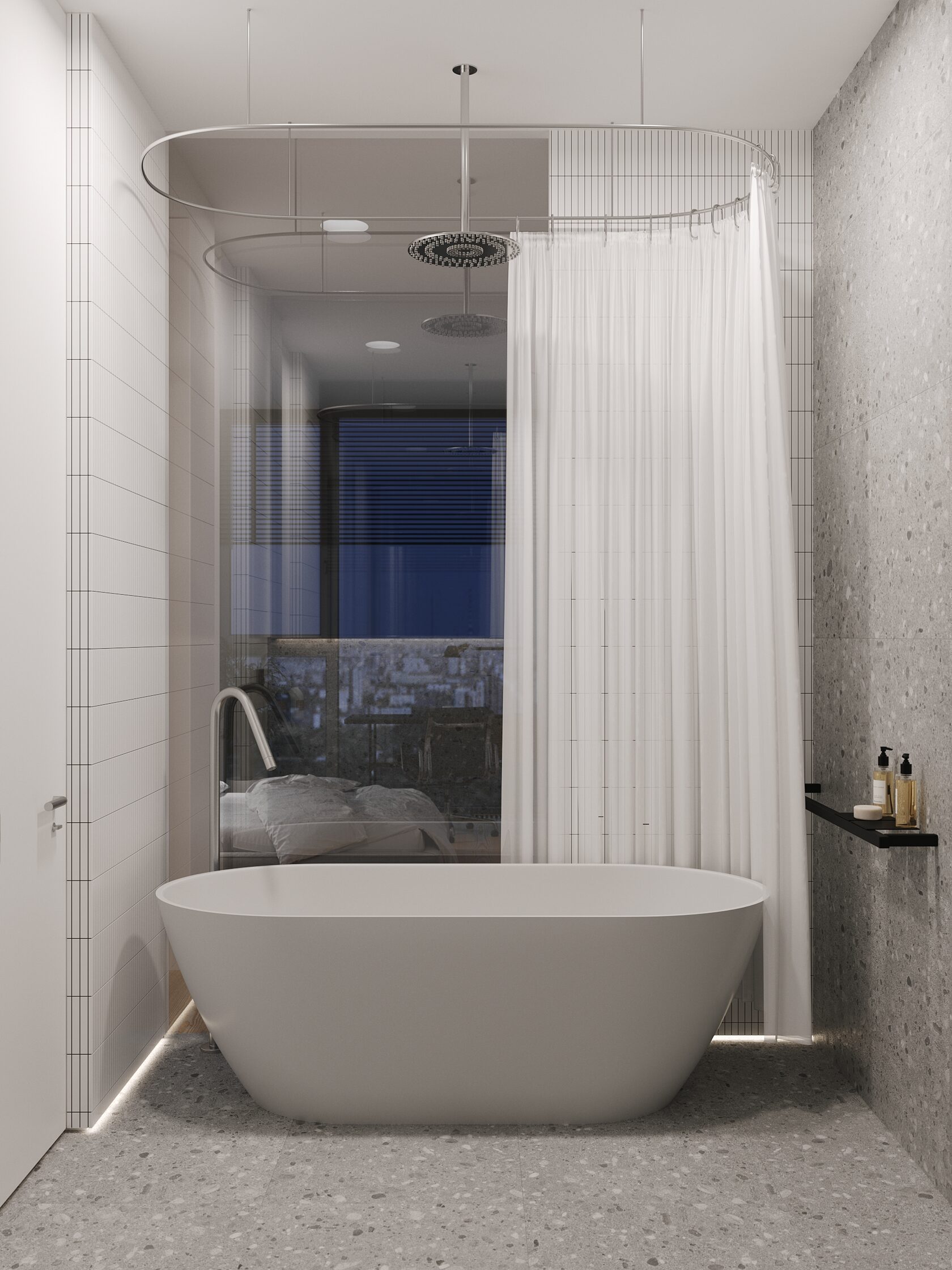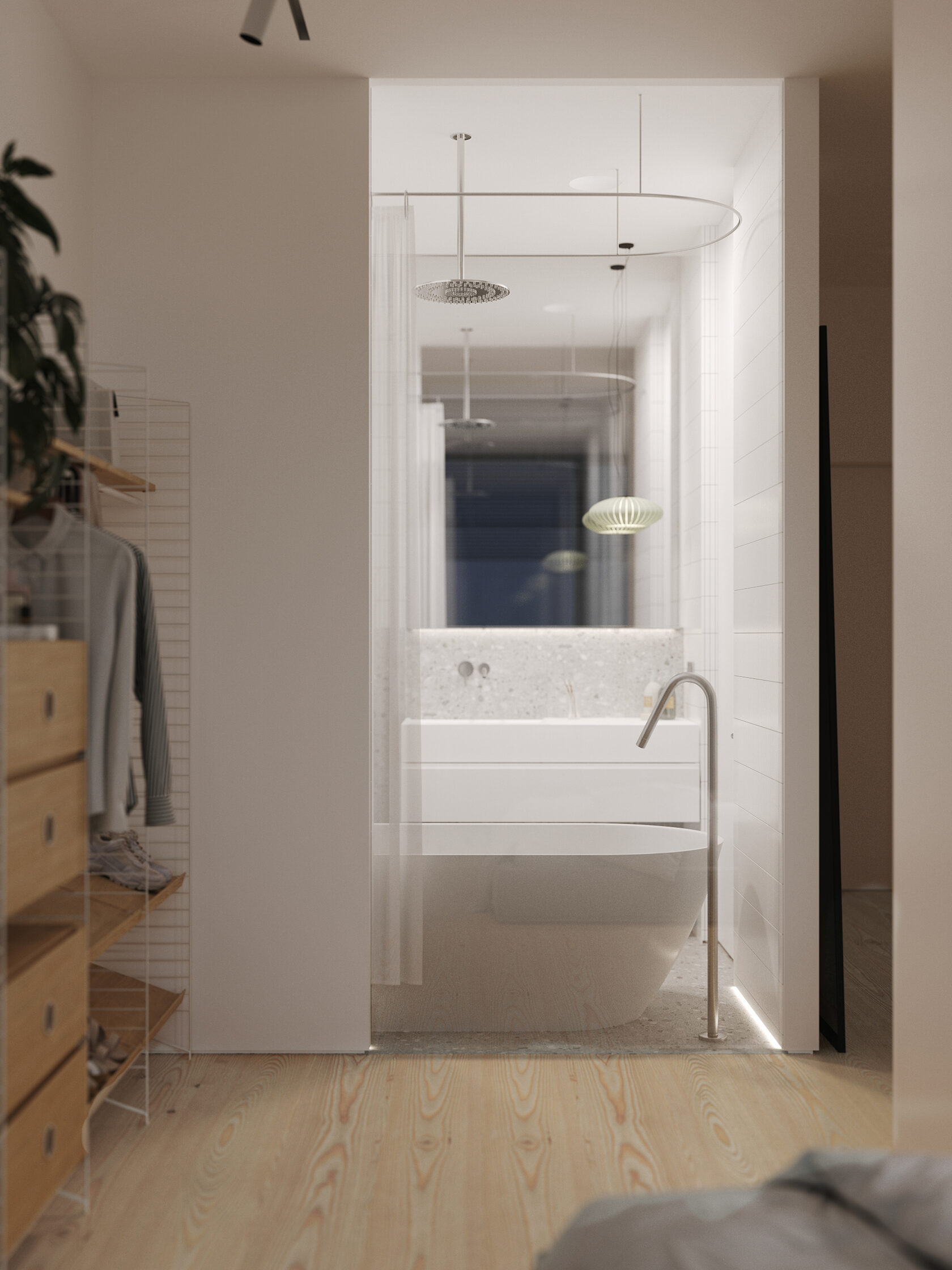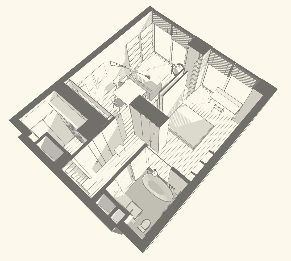Задача: разместить все необходимые помещения, а именно: кухня-гостиная, спальня, гардеробная, прихожая и ванная комната с отдельно стоящей ванной. И все это в 47 м кв. При этом оставить "воздух" в пространстве, чтобы квартира ощущалась одним целым.