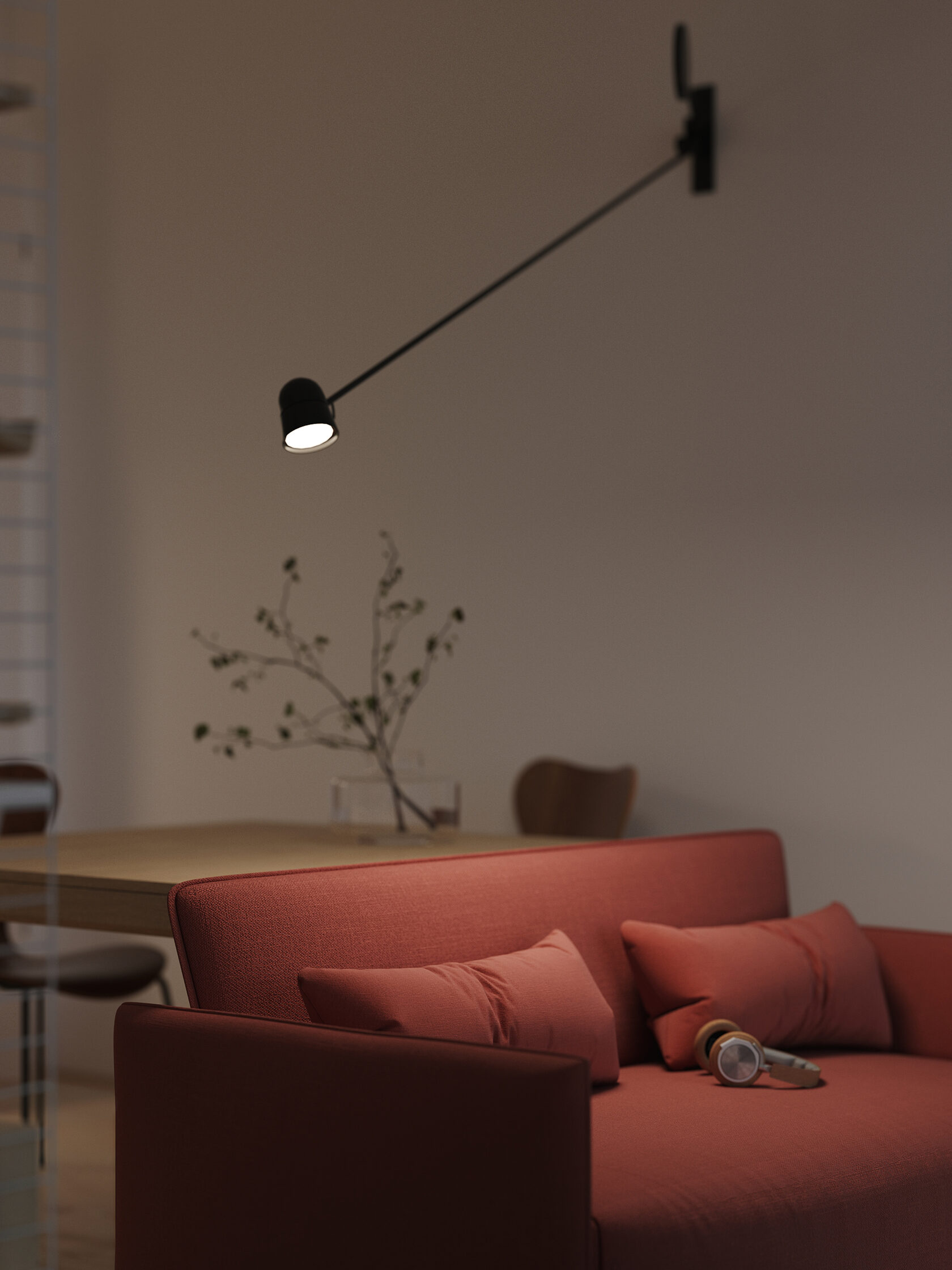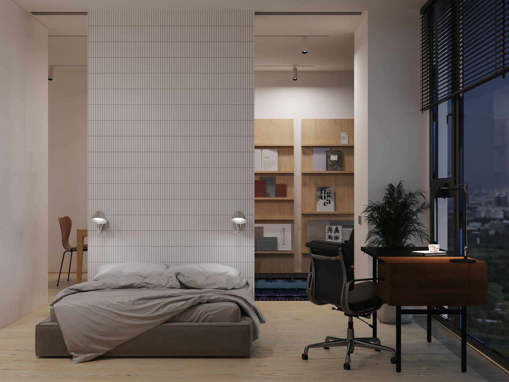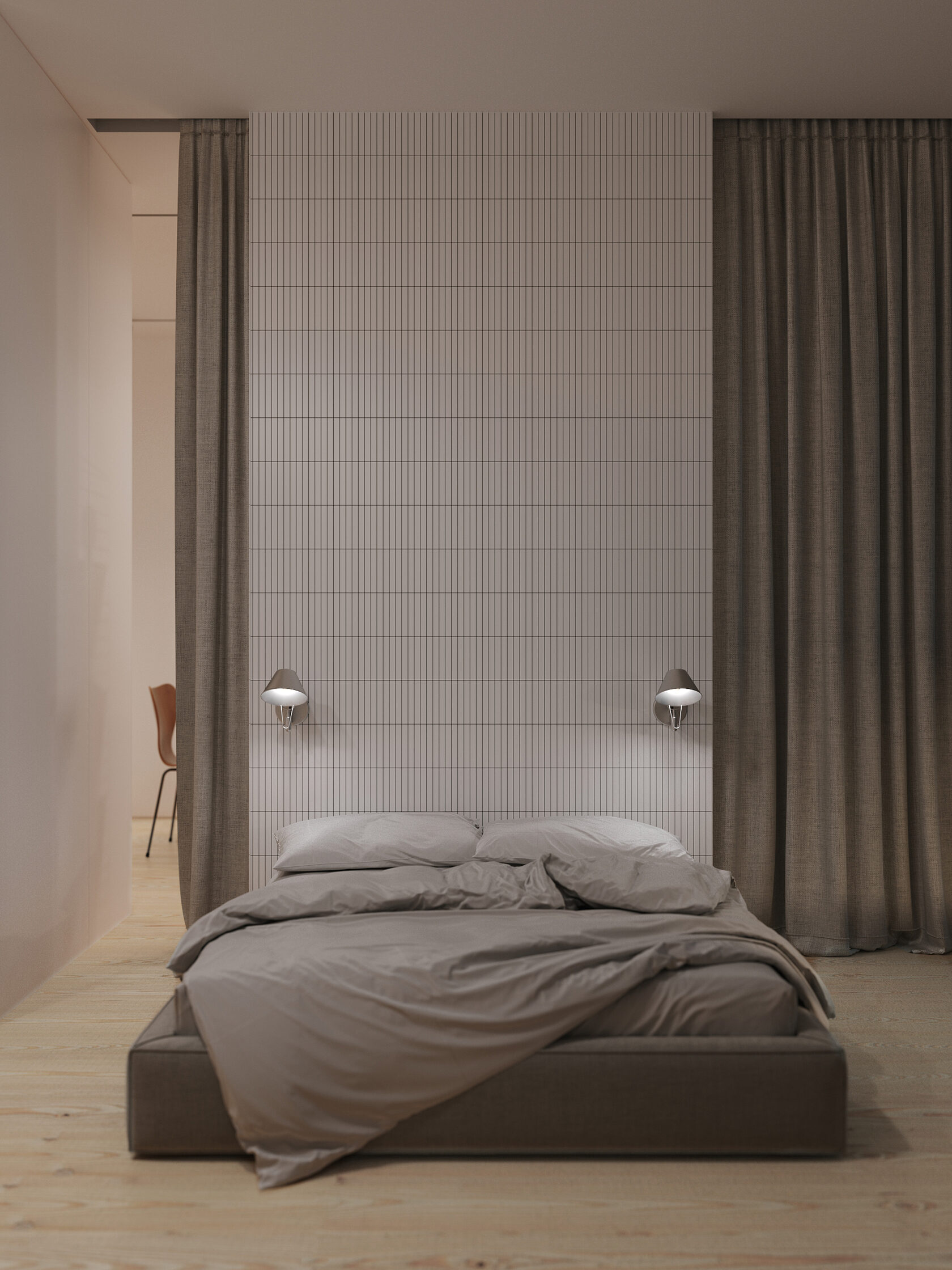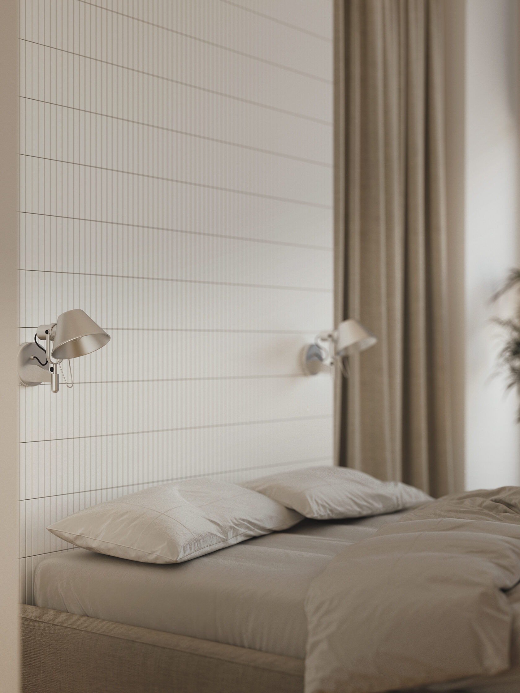 В изголовье кровати висят два бра Artemide Tolomeo которые зарекомендовали себя, как классику.