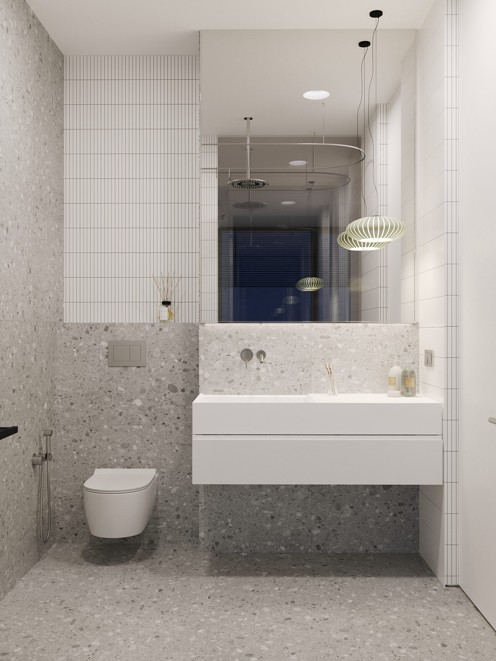 В ванной комнате стены решины из двух фактур: мелкой плитки и крупной плитки натурального терраццо. Над раковиной висит светильник Marset