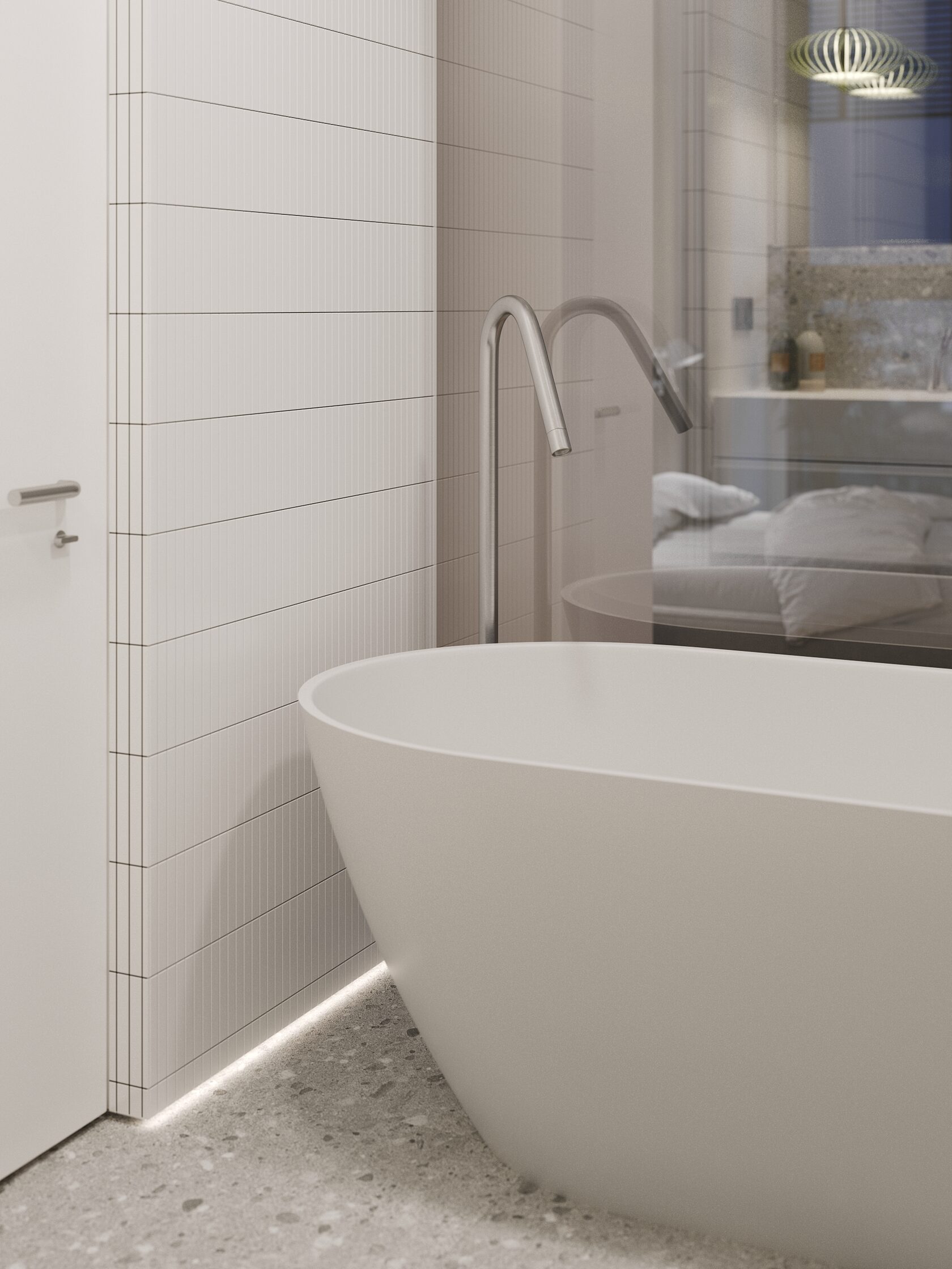 Натуральные материалы – Лиственица, дуб, керамика, стекло и металл. Базовые цвет белый, графичнная плитка полосками, которая использована, не только в ванную комнату, но и перегородке между гостиной и спальней. В интерьере акцент смещен на мебель классики дизайна.