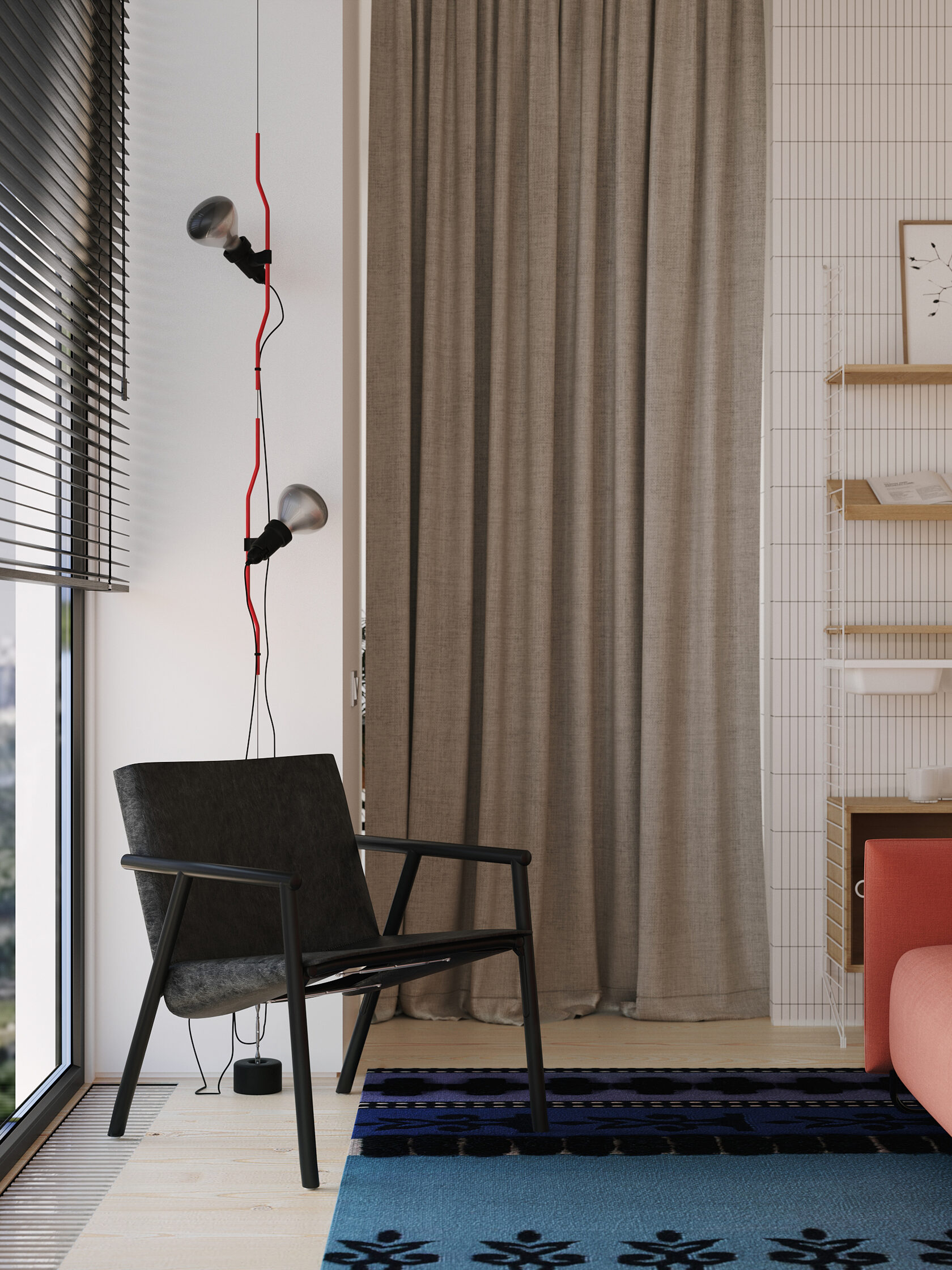 Кресло Pianca из черной ременой кожи рядом со светильником Flos висящем на троссе.